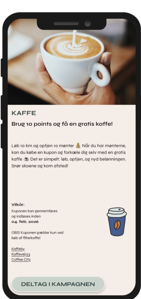 Indimellem lancerer vi særlige kampagner, hvor du skal løbe en bestemt distance for at opnå en udvalgt fordel. Hold øje med hjemmeskærmen i Løbeklubben – kampagnerne er markeret med løbesko-ikonet.
